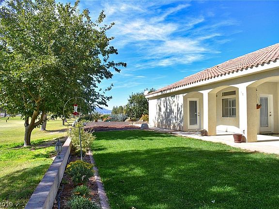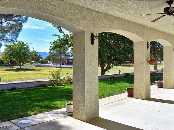 Golf course home on the pond & 10th tee! Home boasts nearly 2,300 sqft, & attached garage is 2,400 sqft! RV section of garage 60' long. Section w/workbench has office w/safe, & 1/2 bath. Master suite opens to extended covered patio, has 5-piece bath w/jetted tub, & walk-in closet. Kitchen w/granite tops & pantry, formal dining rm, eating nook, & open to living room that boasts gas fireplace! Stunning location & views! 1 hr from Las Vegas!