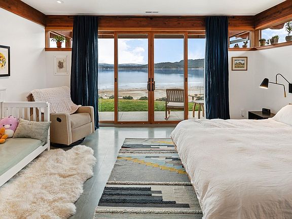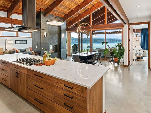 NORTHSHORE WATERFRONT HOME! Stunning home in one of the most desirable neighborhoods in Sandpoint, Idaho. Beautifully designed by renown local architects and craftsmen in 2021, this 3 Bedroom, 2 Bath, 2771 SF home is a masterpiece of timeless design and functional space, utilizing the highest quality materials: VG fir exterior siding, vaulted ceilings w/cedar T&G, atrium-style entry w/floor to ceiling glass, wood double paned windows, concrete floors w/radiant heat, high-speed Ting internet. The inviting kitchen/dining area is built for enjoyment w/large island & double-sided fireplace. The master suite is a luxurious sanctuary w/private patio & bath w/large walk-in shower & deep soaking tub. The big lake is your backyard w/100' frontage and private L-shaped dock topped w/concrete tiles. Large sliding glass doors open to gracious outdoor living spaces, terraced w/granite retaining walls, thoughtfully landscaped w/native plants, and dark-sky compatible exterior lighting. The 3-Car attached garage has a Tesla charging station & studio space w/separate entrance. This is a waterfront gem!