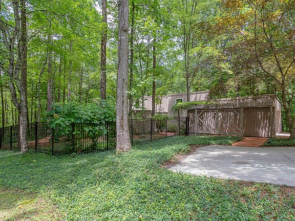 Smart modernist home. 2.6 miles to UNC. Set amidst a tapestry of trees on almost one acre overlooking Morgan Creek. Overall vibe is relaxed, usable & very beautiful. Rooms are infused with light. Great room is hygge chic w soaring wood paneled ceiling, wall of windows & clean-line fireplace. Custom built-in shelving marries storage+style. Renovated kitchen with granite+ sleek cabinets+ window wall. Lyrical sounds of nature greet diners/loungers on the expansive deck. Detached garage insulated+conditioned.
