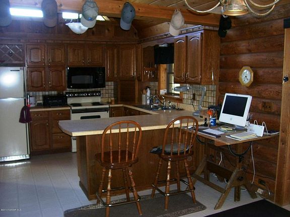 Affordable 3 bedroom 1.75 bath log home on nicely wooded 1.4 acre lot just SW of downtown, 2 garages, fireplace, well maintained. All appliances to stay.