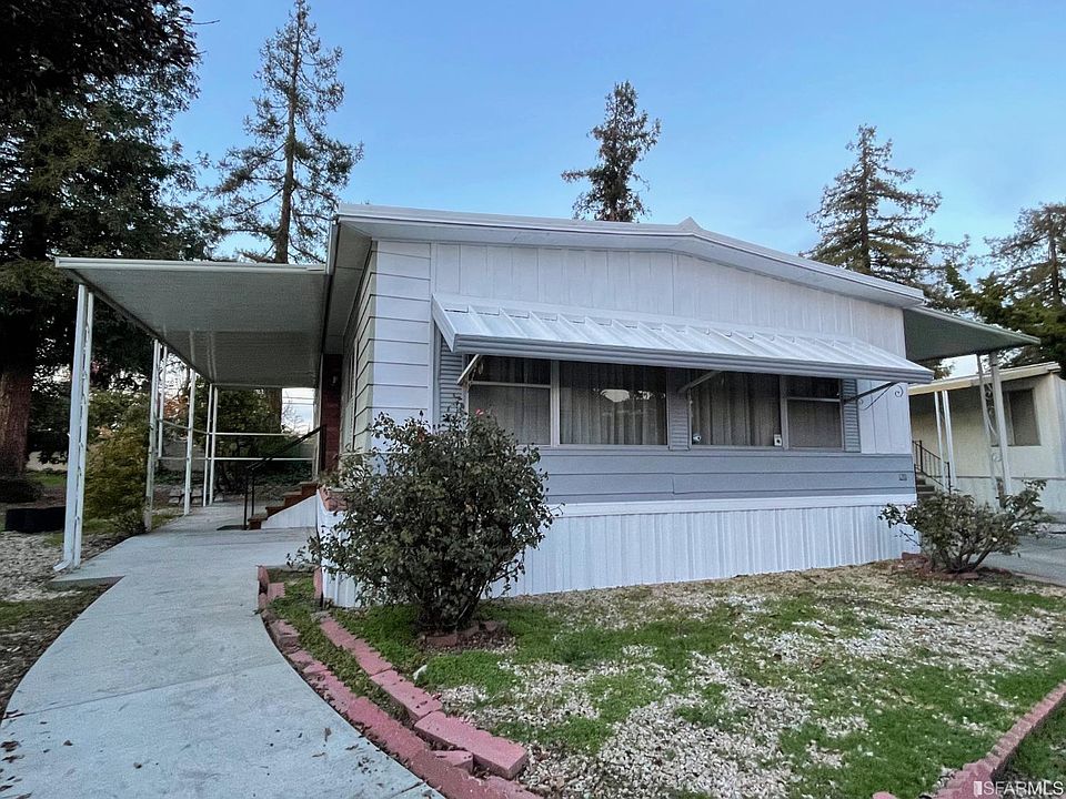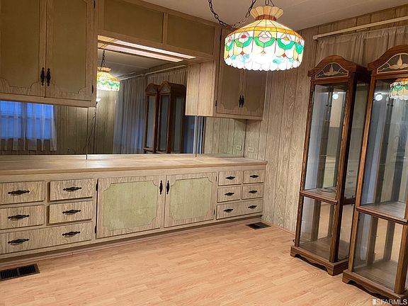 Affordable, double wide manufactured home in an all ages park. The home features a spacious living room that flows to the dining room with built in buffet and cabinet. The kitchen features a dishwasher, gas stove top, double sinks, microwave and bonus desk built in wrapped at the end of the counter into the second living room. The remodeled Jack and Jill hallway bathroom connects to the second bedroom, perfect for a home office or guest room. The large primary bedroom is at the back of the hallway with three closets and bonus vanity counter with mirror in the bedroom. The en suite bathroom is remodeled and updated with beautiful tile, sink and plumbing fixtures. The side-by-side washer and dryer with storage in the laundry room leads to the side door to the covered parking spaces and storage shed. The outdoor area wraps around both sides of the home and is riddled with large, mature redwood trees, a fruiting lemon tree and plenty of room for a garden. This home is primed and ready for a new owner to make it their own.