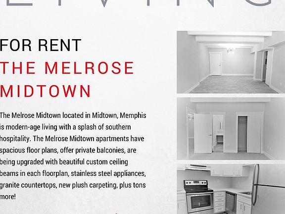 Available for MOVE-IN The Melrose Midtown Apartments ; Midtown PROPERTY CURRENTLY UNDER RENOVATION - RESERVE YOUR UNIT TODAY! One, and Two Bedroom Units Available! This luxurious apartment community is currently OPEN and Leasing NEWLY RENOVATED UNITS! The Melrose Midtown is new face, formerly known as Continental Apartments, located at 1422 Lamar Ave, Memphis, TN 38104. Looking for convenience to Midtown's medical centers, downtown businesses and entertainment, schools, and easy access to I-240 ... Your Search is Over! The Melrose Midtown is your answer to comfort, quality and convenience. You'll enjoy our spacious 1, 2 or 3 bedroom apartment homes with room to roam. The renovations of Melrose Midtown's Mid-rise will definitely set you above the rest. At this community, you'll have a wide selection of features and amenities. Some of these include: high-speed internet access, spacious closets, and private balconies! Pricing Details: Studios with Balcony - $699 /month 1 Bdrm No Balcony - $950/month 1 Bdrm with Balcony - $1,050/month 2 Bdrms - $1,150/month Property Highlights Electronic Access Covered Parking Available Spacious Floor Plans-Lots of Closet Space 24 Hour Emergency Maintenance 1, 2 & 3 Bedroom Apartment Homes Balconies with Storage All Electric Kitchens NEW STAINLESS STEEL Appliances NEW CARPET NEW FLOORING Convenient to Downtown & Medical Center Professional Management Staff Apartment Amenities NEW AGE Fixtures Air Conditioning Cable or Satellite Carpet Ceiling Fan Dishwasher Extra Storage Garbage Disposal Patio or Balcony Tile Floors Walk In Closets Window Covering Community Features Club House Controlled Access Covered Lot Disability Access Elevator Freeway Access Garages Laundry Facility Public Transportation Surface Lot This property will not last long! Professionally Leased By: Leasing Angels, Inc. 5308 Cottonwood Road, Ste 2 Memphis, TN 38118 Office Phone: 901.794.4702 or (510) 92LEASE (925-3273) Call Or Text: 901.857.0266 www.leasingangels.net This is a Leasing Angels, Inc. "Preferred Rental." This is a "Talus Properties" property.