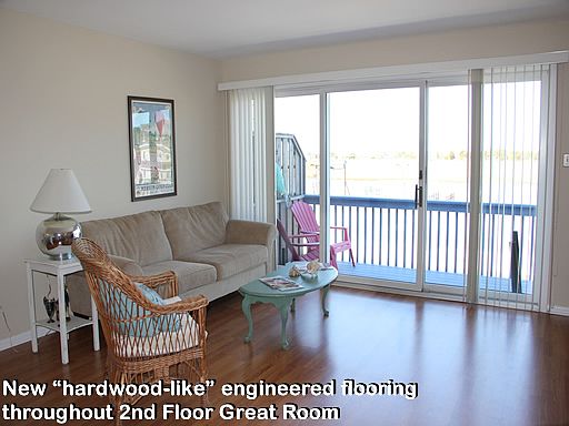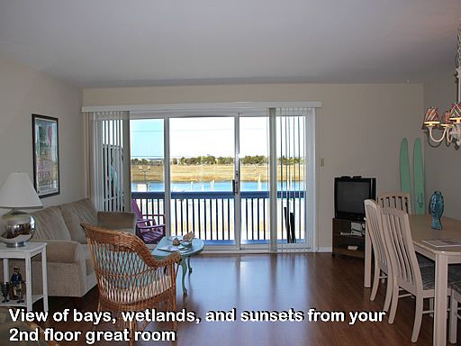 Views of the bay, meadow and sunset as far as the eye can see! All enjoyed from the comfort of your own recently updated two story townhome and bay view deck. The spacious second floor living area is a wonderful surprise as you walk up the stairs and see nothing but great views and amazing sunshine and summer breezes pouring in through wide sliders. The kitchen has been updated with stainless appliances and is convenient to the entire living room. Even the chef can enjoy the view while preparing the familys meals. Situated on this floor is the master suite with semi-private access to the tiled hall bath. New hardwood floor like flooring has been installed along with a fresh coat of paint to brighten the second floor. Brand new heat pump installed spring of 2016.