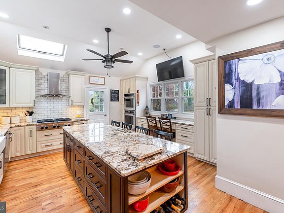Welcome to this exceptional five-bedroom, three full bath, and one half bath colonial masterpiece, perfectly situated in the heart of Berwyn. Spanning an impressive 4000 square feet, this home is a true haven of comfort and style. As you step inside from the driveway, you're greeted by a beautifully updated kitchen with vaulted ceilings, Skylight, large granite island ,Top of the line 6 burner stove and double ovens, one convection, and top of the line refrigerator perfect for culinary enthusiasts. The adjacent dining room has elegant wood floors, a wet bar with wine cooler and creates a warm and inviting space for family gatherings and entertaining guests. Great flow from the kitchen thru to the formal living room with a wood burning fireplace. Enhanced trim and crown molding. All hard woods on this level From the front foyer, Venture to the lower level, where you'll discover a radiant heat family room, complete with a gas fireplace, ideal for relaxing evenings. The level also boasts a large wet bar with wine fridge and a game area making it perfect for hosting friends and family. There is a powder room off the Family room and a separate entrance makes it easy to access the beautiful hardscaped patio overlooking a private fenced in back yard featuring an inground saltwater pool with multi color lighting and separate hot tub. Enjoy sitting under the stars in the custom Pergola or perhaps roasting marshmallows in the separate fire pit area. There are two exterior sheds. On the second floor, you'll find the master suite with 4 closets and a custom tiled bath and two additional spacious bedrooms, and a hall bath, Ascend to the third level to discover a private au pair suite featuring a separate entrance, two versatile rooms, and a full bathroom, providing ultimate privacy and flexibility. This home is not just a living space; it’s a lifestyle. Experience the perfect blend of classic elegance and modern amenities at 1421 Pennsylvania Ave. 5-minute walk to the R 5 train line and less then 10 min walk to the Upper main line YMCA. Don’t miss your chance to make this stunning property your own!