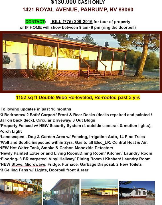 This 1152 square foot mobile / manufactured home has 3 bedrooms and 2.0 bathrooms. This home is located at 1421 Royal Ln, Pahrump, NV 89060.