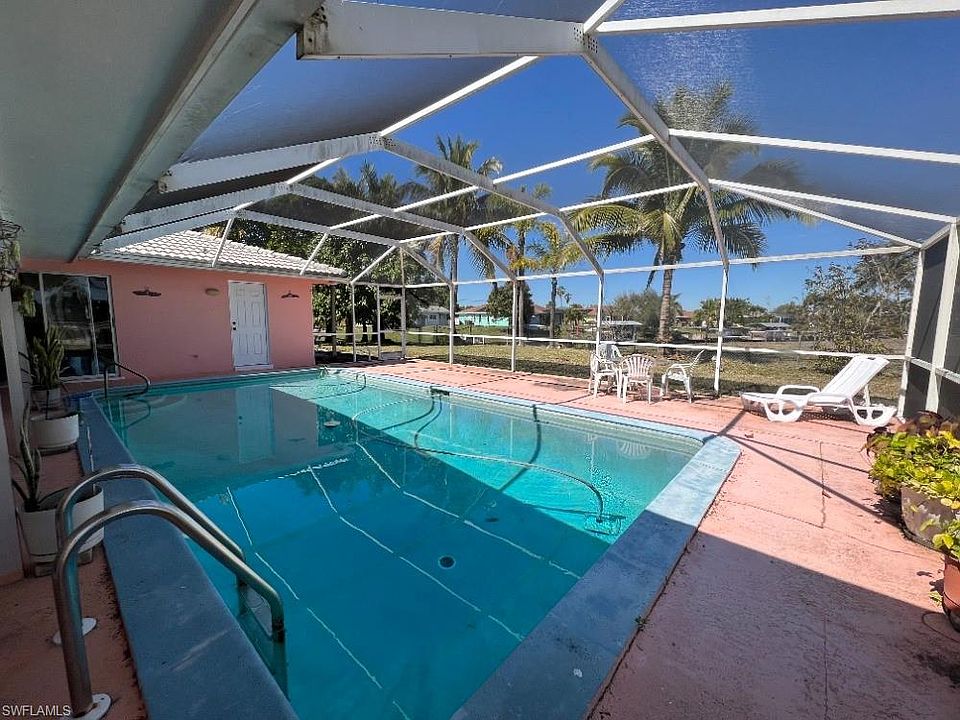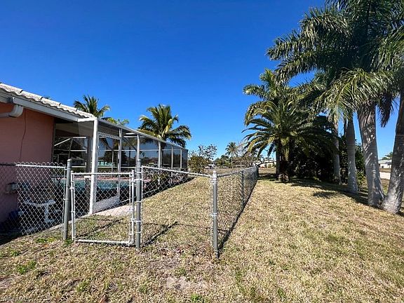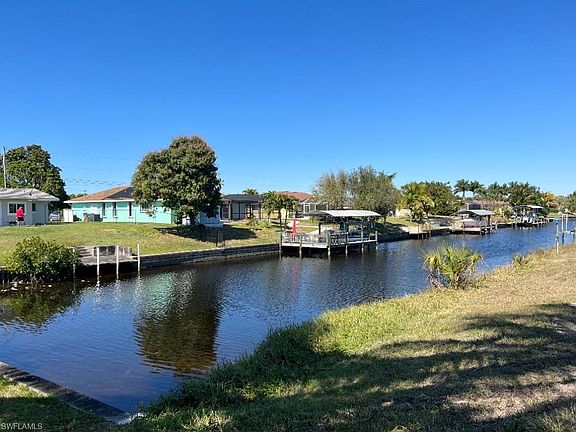 Your Perfectly located 3/2 home is a block away from Cape Coral's most recognize street 'Del Prado Blvd.' On Del Prado you'll find many great tasting restaurants & department stores! At just twenty minutes away from Ft. Myers Beach, this home offers it's own aquatic amenities. CITY WATER IN & PAID IN FULL and a large 14 x 28 foot pool. You can sit down on your comfortable couch and enjoy a beautiful view of your pool with the canal in the background. The pool has access to it's own bathroom. As you park your vehicles, you'll notice the previous owners admiration for Mother nature. This property has tall trees that hug the driveway. Fresh coconut trees in the front and backyard, Mango trees, a Sugar Apple tree & a Plum tree. In addition, this property sits on a corner lot which allows for a great panoramic view. Inside the home you'll notice great big windows which allow for natural lighting. This house is just waiting for it's next owner to make it a home! (2007 Tile Roof, 4 year old water heater, 6 year old AC, hurricane impact windows, no flood insurance required & irrigation system in place)