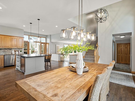 This modified two-story home is located in the highly desirable neighborhood of The Wilds in Prior Lake, perfectly situated on a larger corner lot at the end of a cul-de-sac with a small park just a few blocks away. It’s in the sought-after 719 Prior Lake school district and zoned to Jeffers Pond Elementary. Located directly across from Hole #5 of The Wilds Golf Course, the property offers both privacy and scenic views. The oversized three-car garage offers ample storage, built-in shelving, and cabinetry, and includes extra room for your golf cart. Outside, you’ll find beautiful 2024 landscaping, including a rock retaining wall, and a 17x18 deck with stairs leading to a paver patio below. A sun room with a gas fireplace overlooks the deck and yard, providing a cozy retreat. Inside, the open-concept kitchen and dining area—remodeled in 2022—feature granite countertops, stainless steel appliances, and a large center island with a built-in beverage fridge. The expansive living room includes a gas fireplace with custom built-ins. The main level also offers a flexible office or bedroom with an attached 3/4 bath, and a welcoming entryway with a built-in bench and hooks. Upstairs, there are four bedrooms, including a spacious primary suite with dual vanities, a jetted tub, separate shower, and his-and-her closets with built-in organizers. Two additional bedrooms feature walk-in closets with built-ins, and one boasts vaulted ceilings. The finished walkout basement includes a wet bar with a beverage fridge, a stylish accent wall, generous storage space, and a flex room that could be converted into a sixth bedroom with the addition of an egress window. A rough-in for a shower in the storage room provides the option to turn the lower-level half bath into a full or three-quarter bath. Additional updates in 2024 include the installation of a tankless water heater and new carpet throughout the main level, staircase, and upper hallway. There is also a secured access closet under the stairs in the basement that can only be opened using the seller’s fingerprint—this unique feature is available for viewing with an accepted offer. The Nest camera, garage refrigerator, and both beverage fridges are included in the sale.