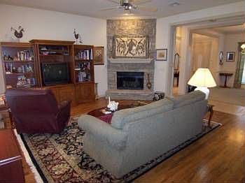Great floorplan w/3 bedrooms down, 4th bedroom (or gameroom) upstairs w/full bath. Family room w/hardwood floors opens to kitchen area. 10 ft ceilings/full brick exterior/crown molding thru-out. Neighborhood pool.