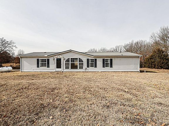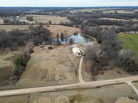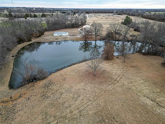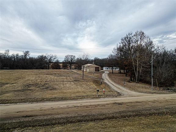 You will fall in love with this picturesque 14 acres. This modular home has right under 2,000 square feet of living space. Ample living space that boasts a rustic den that includes a fireplace, dining room, and spacious living room with natural light in abundance. The primary bedroom boasts a large private bath, and walk in closet. Two other bedrooms share a bathroom on the other side of the house. The spacious kitchen has room for a breakfast table and walks out to a deck that overlooks the 2+ acre stocked pond. The insulated 40X70 foot shop has a heavy concrete floor. In 2023 the renovation included new wiring, with led lights added. A lift and an A Frame make this the perfect place to work on cars. The septic system was replaced in 2019. All appliances stay and it includes a security system. A MUST see. 1/2 mile off blacktop and a short 3 miles to 49 Highway. 41 minutes to Lees Summit and 50 minutes to Overland Park.