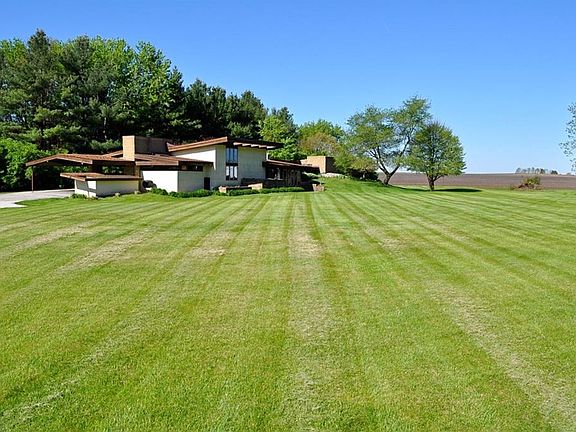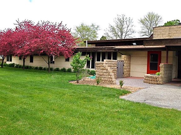 What a unique design and serene setting this three bedroom ranch home offers! Sitting in a beautiful private neighborhood, this home was inspired by the architecture of Frank Lloyd Wright. Almost 1800 sq.ft. on one level with no steps makes for ease of living. Open layout adjoins the common areas with plenty of space for all your family and guests! Distinctive great room with multi-level ceilings and a wood-burning fireplace. Attached is a 4 seasons room: a perfect place to watch all the wildlife. Beautiful bushes, lilies, and ornamental grasses bring perpetual color to the home. Raised planters can be used for vegetables or more flowers. Illuminated driveway brightens your pathway to home!