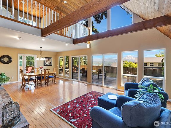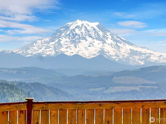 Outstanding Mount Rainier views greet you from the great room and upstairs loft. Over 3,300 square feet of space, including huge basement with room for games, exercise and media, plus partially finished space for storage, workshop and wine cellar. Large primary suite on main floor plus two additional bedrooms upstairs with 3/4 bathroom. Large two-car garage plus room for RV parking. Huge lot has room for storage shed, big toy and horseshoe pit. Great room and downstairs rec-room both have masonry fireplaces to keep you cozy in the winter plus a heat pump to keep you cool in the summer. Quartz counters in the kitchen and all kitchen appliances stay with home. With main floor utility, this home can live like a rambler if you prefer!