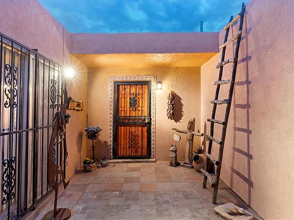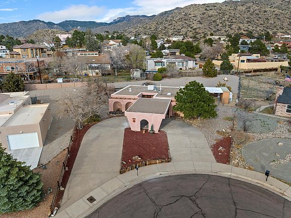 Enter through the gated courtyard to this Southwest, well-cared for home situated at the base of the Sandia Mountains. This 3 BR, 2 BA home offers 2 living areas, large kitchen and nook area with decorative wall, views of the mountains and sits on a spacious lot. Home offers a functional floorplan; the living room is perfect for cozy evenings by the corner, Kiva fireplace, and is an ideal area for entertaining. The original Primary bedroom offers a A3/4 bath and has a slider for direct access to courtyard. The south bedroom has new hard-wired baseboard heating. Xeriscape Front and Backyards/Backyard has pergola, mountain views and a shed. Large drive-up carport and circle drive. With its Southwestern charm, this home offers a truly unique and delightful living experience.