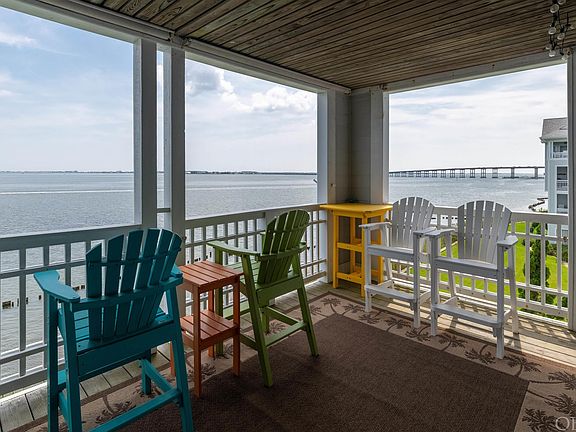 WHAT A VIEW! Enjoy endless unobstructed direct sound views from your covered Soundfront deck or interior living, dining and kitchen area that all face the Sound. This mid level (well insulated!) unit in Ballast Point has been lovingly maintained as a true 2nd home (not currently rented) and offers single story and maintenance free waterfront living. A welcoming foyer greets you along with bedrooms 2 and 3 on each wing of the foyer as well as the 2nd full bathroom. Step into your open living, dining and kitchen area where you are greeted by a wall of water view windows. Entertain at the large breakfast bar or enjoy an evening of games around the gas fireplace. The primary bedroom and en suite private bathroom are located just off the living area facing the Soundfront, and you will wake up to views that make you feel like you are on a cruise ship. Last but not least, you will likely spend most of your time on your waterfront covered deck where you can watch all kinds of wildlife, boaters go by, and begin and end your day with sensational sunrises and sunsets. Not to mention, this unit is sold fully furnished, including an Electric Golf Cart with 4 new tires (2022) and 6 new batteries (2022)! The gated community of Pirate's Cove is situated on about 128 acres with gorgeous views of protected marsh grasses, wetlands, canals, and the Roanoke Sound. The community amenities include everything from a clubhouse, fitness center, 2 pools, tennis, basketball and volleyball courts, playground, 4 miles of common area boardwalks, an outdoor pavilion, sound access, and on-site restaurant and tiki bar ... all just a short walk or golf cart ride away! Recent updates include: New kitchen backsplash; New Electric glass top stove 2020; New Dishwasher 2020; New Garbage disposal 2020; New Refrigerator 2021; many New light fixtures in main living area; New King size bed frame and mattress in primary and guest bedroom 2020; New GFI outlet on patio 2023; New AC closet door and coils 2021; New storm door 2022; New sofa and 2 New recliners 2020; 2 New Bedroom TV’s 2021/2022; and New Living room TV 2023. You are just minutes to the gorgeous beaches of the Outer Banks, Oregon Inlet, and endless shopping, restaurant and entertainment options in Downtown Manteo and Nags Head. This property offers the Outer Banks oasis getaway you have been waiting for!