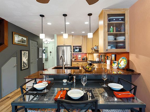 With a beautiful view of Mt. Shasta and surrounded by natural landscape with trails to City Park, this stunning artfully designed remodeled home features a fabulous kitchen w/ stunning red dragon granite countertop, custom alder cabinets (built locally), floor to ceiling storage, undercounter lighting, lazy Susan corner cabinets, appliance garage, built-in microwave space, propane gas cooktop range/single electric oven, & tiled floors. Open floor plan offers a dining & living room w/ premium hickory hardwood floor, ceiling fan & view of the outdoors facing spring Hill and Mount Shasta. As you exit the double French doors with inset mini blind panels, you will walk out onto the custom flagstone patio to enjoy the all-natural meadow & forest w/ no other townhomes or buildings visible. Large master bedroom (14 x 22) features double closet w/ sliding doors, extra storage above stairwell & a redwood balcony overlooking Mt. Shasta and the local natural area. Master bathroom sports heated floor w/programmable thermostat, built-in antique armoire for linen storage with hallway loading access, double basin Japanese sinks & custom cabinets matching armoire. Truly a one-of-a-kind find!!!