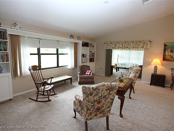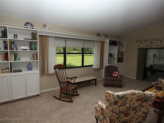 Welcome to Pinecrest Villas! This villa is located on the 14th green of the 1926 Donald Ross designed Pinecrest Golf Course and is currently the most affordable home on the course. It is only one of four units within the villas that has the much-desired vaulted ceilings feature. The westerly exposure offers stunning sunsets over the golf course and Lake Lotela in the distance. The home is very neutral throughout and clean, neat and move-in ready. Step inside to the spacious foyer. To the left is the big kitchen with room for a breakfast table for casual meals. A long step-up peninsular bar divides the kitchen from the dining room. The counter tops are white solid surface and the cabinetry is white. The dining room and living room creates a large open area and the vaulted ceiling makes this space light and bright. The living room has a beautiful view of the golf course and includes a wall of custom built-in cabinets. Beyond the living room to the right is a Florida Room. This space also overlooks the golf course. The spacious primary bedroom includes a wall of custom built-ins, a private bathroom with walk-in shower and a double linen closet. The spacious 7x6 walk-in closet has lots of closet storage space. To the right of the foyer is the guest suite and hall/ guest bathroom. Off the kitchen is a small home office or craft room. The flooring is white porcelain tile in the foyer, kitchen, hall into the guest bathroom and both bathrooms. You can remove the carpet in the dining room and living room and this same tile is under the carpet if you prefer tile. The bedrooms and Family Room have carpet. The front exterior of the home has a patio entrance - a perfect spot to enjoy the Florida sunshine. It has higher walls for privacy. A backdoor opens from the Florida Room to the backyard overlooking the golf course and partial view of Lake Lotela.. The unit is nicely landscaped. The two-car garage has plenty of room for your golf cart. The roof was replaced in 2022and the AC was replaced in 2021. You are a short golf cart ride to the clubhouse, Sandhill Grill Golf Club Restaurant, and the driving range. THIS IS A 45+ YEAR OLD ADULT COMMUNITY.