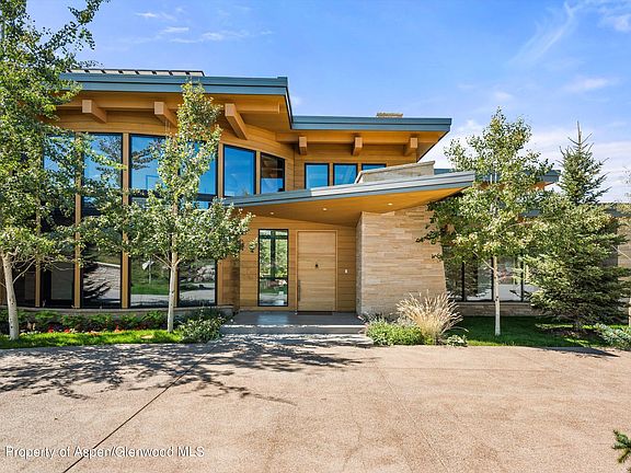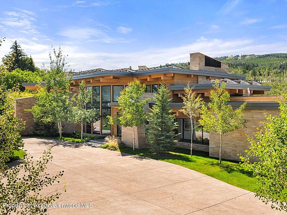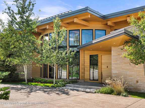 One of the most extraordinary homes to be offered in Aspen. With contemporary lines and stunning views of the Owl Creek Valley, Buttermilk and Snowmass, this spacious 6-bedroom, 6-bathroom retreat features numerous indoor/outdoor living spaces and high-end finishes, just minutes away from Aspen and sits on 2 private acres. This architecturally significant property has an open floor plan with soaring 25ft ceilings, massive windows, and custom steel and glass railings. It is the perfect home for entertaining, with seamlessly connected patios and decks (including an outdoor living room), chef's kitchen, separate dining room area, fire pit, wine room, wet bar, 3-floor elevator and large media/game room.The two acre property includes mature landscaping and extensive hand cut, dry stack Colorado Buff stonework.