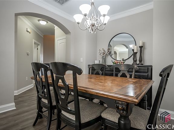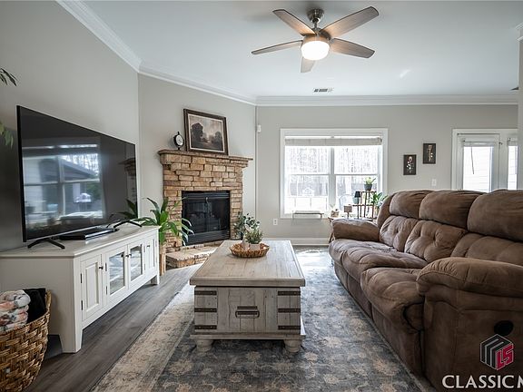 Welcome to Franklin Grove, a gated community in northern Oconee County alongside Highway 78, a convenient 10 miles from the UGA campus. This lovely 3 bedroom, 2-½ bath townhome has been freshly painted and tastefully updated with luxury vinyl plank flooring and 2-inch white window blinds. The main level consists of a two-story foyer, a combination family/dining room complimented by attractive archways, a corner stone fireplace with an electric log insert, and crown moldings. An eat-in kitchen has new LG stainless steel appliances, painted cabinetry with granite countertops, gray