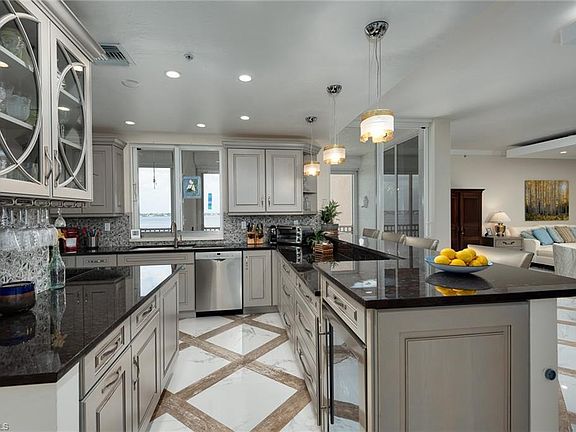 Riverfront 6th floor 3 Bedroom 3 Bath, 2 Lanai's + Balcony, 2,560 s.f. under air. Spectacular Dwayne Bergmann Kitchen, Dining & Living Areas Remodel. Wall removed and Kitchen expanded creating Panoramic River Views as soon as you enter the foyer. Custom Kitchen Cabinetry with floor to ceiling Center Island with China Hutch, Granite Counter, Glass and Ceramic Backsplash, Stainless Appliances, Cook Top & Wine Cooler. Dramatic Ceramic Flooring a combination of Marble and Wood look all Living Areas and Ensuite Guest Bedroom, Ceramic Planking in Lanai and 24"x 24" Marble look Master Bedroom & 2nd Lanai. Living Room & Dining have Custom Lighted Dropped Ceiling Panels and Formal Dining Custom display & storage Hutch + $11,000 Crystal Chandelier. Storm Rated Window Wall added in Riverfront Dinette, Family Room + Electric Storm Shutters both Lanai's. Master Bath has Ceramic surround Shower & Frameless Glass enclosure. Office space & Cabinetry by California Closets, Decorative Storm Impact Glass and Leaded Front Door insert. 186 slip deep water Marina with slips available for lease or purchase. Some amenities herein available but not offered. Master Fee: $1,250/Annually, Condo Fee: $783/Mo.