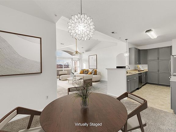 Back on the market, Buyer had cold feet. No fault to the sellers! This condo stands out from the rest with its TWO deeded garage spaces, mountain views, and a unique and RARE primary bedroom layout that can functions as an additional bedroom or flex space. The floor plan is included in the images. Experience this expansive condo located in the Cherry Grove East II community, situated on the top floor with vaulted ceilings, ample natural light, and the peace of no upstairs neighbors. The freshly painted walls complement the generous layout of two bedrooms, two bathrooms, plus a flex room, covering 1,543 square feet and featuring a built-in study area. The kitchen is well-appointed with plenty of cabinet space, stainless steel appliances, and a dining space. The sizable living room grants access to the covered balcony, complete with two storage areas at each end. The primary suite is equipped with a ceiling fan, spacious walk-in closet, and an ensuite full bathroom. The convenience of a large laundry room with an included washer and dryer adds to the appeal. The community offers a pool and hot tub for relaxation. Numerous amenities are within a short distance, including restaurants, shopping centers, golf courses, the Highline Canal, and the 2nd Ave and Abilene light rail station. Located with easy access to I-225, it's only minutes away from the University of Colorado Anschutz Medical Campus, VA Hospital, and Buckley Air Force Base. Ready for move-in and boasting four total parking spaces, this condo is perfectly situated for both convenience and comfort.