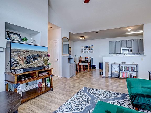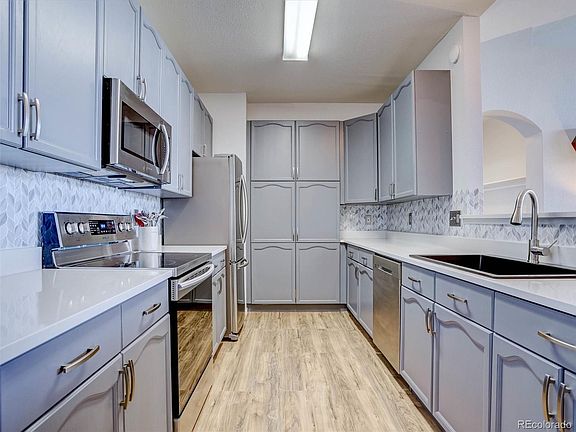$10,000 SELLER CONCESSION towards closing costs or a rate buy down! Step into this beautifully updated 2-bedroom, 2-bathroom condo, with a 1-car garage, that offers stunning mountain views and unbeatable convenience! Located just minutes from I-225 and a short 3-minute walk to the 2nd & Abilene Light Rail Station, this home is perfect for commuters and city explorers alike. Inside, soaring vaulted ceilings and stylish vinyl plank flooring create an inviting, open-concept living space. The kitchen is a chef’s dream, featuring painted cabinets, a chic backsplash, stainless steel appliances, and Quartz countertops with an integrated sink. The dining area flows seamlessly into the living room, where you can relax and take in breathtaking mountain views as you unwind. The spacious primary suite has vaulted ceilings, a walk-in closet, and a full en-suite bath, with a perfect view of Mount Blue Sky to greet you every morning. The second bedroom makes an excellent office or guest space. Enjoy the convenience of in-unit laundry, and watch the sunset from your private patio. This prime location offers excellent walkability to Target and a short drive to Town Center shopping and dining. Plus, with two parking passes and a visitor pass, you’ll always have space for everyone to park.