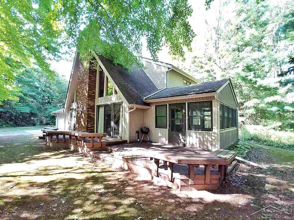 Pub: located on very private 6.5 acres this A-frame chalet is the home you've been looking for! With a main floor Master suite vaulted ceilings enclosed porch and a great view from every part of the house you can't go wrong! Plenty of privacy, pole barn workshop, large basement area, 2.5 baths & move in ready! Call for your showing today before it's gone!