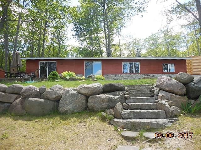 Breathtaking view: You must make your personal showing of this lake front home with 100' frontage. Situated in the back of this beautiful private road to 5.25 acres. The wood and stone inside/out is remarkable. This 1948 Cabin has been remodeled, contains 3 bedroom, open living room, kitchen and dining, Fireplace with a Woodstove, stunning bathroom with a stone shower and claw foot tub! There is a covered front porch, rear patio that goes down to Lake with dock and boat shed, two detached garages 26'x24' & 28'x24' w/10'leanto off one side. There is Natural Gas here, new Anderson windows, roof is 3 years old. Located on Big Bear Lake which is an all sports lake with plenty of fish and wildlife. Rural wooded site. There is thousands of acres of State and Federal forest nearby.