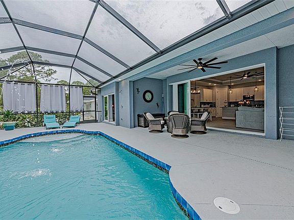 WHY WAIT TO BUILD!?! Exquisitely built in 2021 by Turnkey Homes with a HEATED SALTWATER POOL!! BRIGHT AND AIRY with over 1600 square feet, this grand, split bedroom stunner showcases a double leaded glass entryway door, a large open air covered front patio, high ceilings, pocket sliders in the living room and master suite for access to the pool deck, an open floor plan, rounded corners, extra wide baseboards, trendy/modern lighting and ceiling fans throughout, an inside laundry room, epoxy floor in the garage and the 2 voguish barn doors that add to the character and charm present here -- allowing the guest quarters and the master suite to be closed off from the main living space! The luxurious and continuous wood-plank look tiled flooring throughout this home is simply divine! The classy chef kitchen boasts upscale glass tiled backsplash, granite counters, an abundant breakfast bar/island with fashionable pendant lighting, a closet pantry, crown molding on the upper cabinetry and stainless appliances. An extensive tray ceiling adorned with generous crown molding occupies the main living spaces, giving the "WOW" feeling as soon as you enter the home! The master suite has a large walk-in closet, pocket slider to the pool deck and an en-suite bathroom with granite counters, dual sinks, private commode and a sizable tiled walk-in shower! Enjoy your heated, saltwater pool complete with dual fountains for added tranquility and enjoyment! Plenty of space to relax in the sunshine on the pool deck or relax in the shade under the 24x8 covered deck space complete with a modern ceiling fan to keep the air flowing. This home is lushly landscaped and pleasantly manicured with numerous palm trees PLUS is embellished with lines of shrubs along the rear and sides for added privacy once they are grown in! Conveniently located to multiple public golf courses, shopping, restaurants and quick access to the beautiful beaches of Boca Grande, Englewood, Manasota and Venice!! Schedule a showing TODAY - your Florida dream is ready to be fulfilled NOW with all that this home has to offer!!