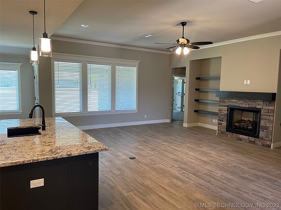 GRANITE KITCHEN OPEN TO LIVING ROOM...MODERN TOUCHES W/OPEN DECORATIVE SHELVING SITUATED