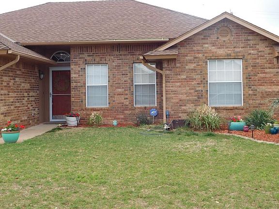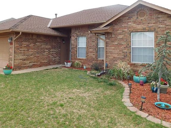 BACK ON THE MARKET!Inspections done, title work...PLEASE EXCUSE THE MOVING BOXES!THIS ONE IS READY FOR YOU!Homey yet modernized!3/2/2 brick home that backs to a field (no neighbors) on a culdesac qualifies for a 100% USDA home loan!Landscaped front/back & brick mailbox.Unique ceiling heights so rooms look 'roomy!Corner fireplace uses gas and/or real wood.Open living/dining/kitchen.Updated color scheme...but not tacky!GE gas stove/oven, bltin GE stainless microwave, Frigedaire stainless dishwasher, Maytag stainless refrig to stay, disposal, Tiffany glass styled lights in kitchen & has a pantry. Rubbed bronzed lighting, stylish mirrors in baths, walkin closet in master, lots of storage, laundry room.City utilities.Privacy wood fence all around, gutters, covered patio for sitting out relaxing, garage door opener & alarm system.Carpets cleaned but worn, so sellers offering 1000 flooring allowance...you pick.25 mins to airport/35 mins to Tinker AFB.