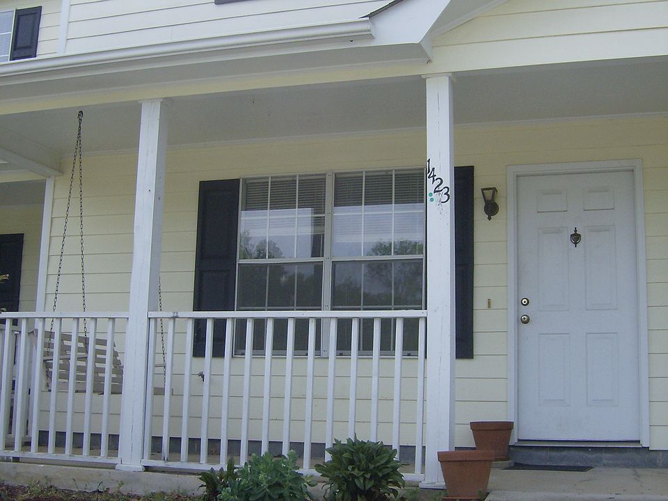 This is a single-family home. It is located at 1423 Flintwood Dr in Rock Hill, South Carolina. Two-bedroom townhome close to interstate and shopping. Welcoming front porch with swing. Large bedrooms and inviting living space. Back patio backs to open grassy play area leading to trees for added privacy. The nearest schools are Rosewood Elementary School, Sullivan Middle School and Fort Mill High School. Charlotte: 15 minutes, YMCA: 12 minutes, Food Lion: 5 minutes, Harris Teeter: 8 minutes, Public Library: 13 minutes. Amenities: Central A/C and Heat, Dishwasher, Fireplace, Refrigerator, Washer/Dryer included, Lawn care, excluding beds, Ceiling fans, Open floor plan, Decorative details make homey atmosphere, Newly painted, Outside utility room. Details: 1100 square feet, 2 bedrooms, 1.5 bath, Townhome style layout (two bedrooms with full bath upstairs), Utility room with washer and dryer, Large open dining/living area, Comfortable kitchen.