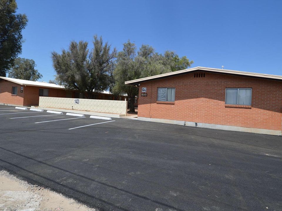 Freshly-painted 2 bedroom apartment. Quiet neighborhood near Sprouts Market. Small complex with trees. Single story, 6 units per building that face each other. Courtyard with trees and picnic tables. Close to bus lines and shopling. Many long term tenants. Owner pays for their water and utilities. Renters pay electric (TEP) and SW Gas. $200 Non-refundable pet deposit, no smoking, $20 a month for garbage and water.