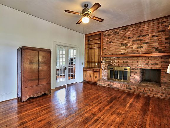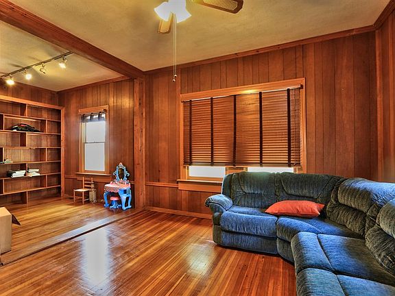 Beautiful lot with large trees. Large front porch, Living Room with fireplace with French doors that lead to Dining Room. Great room with office, playroom or study with built in shelving. Hardwoods Large detached garage. It only has one garage door plus walk in but seller said he had 3 cars in at one time. fenced backyard. Lots of character