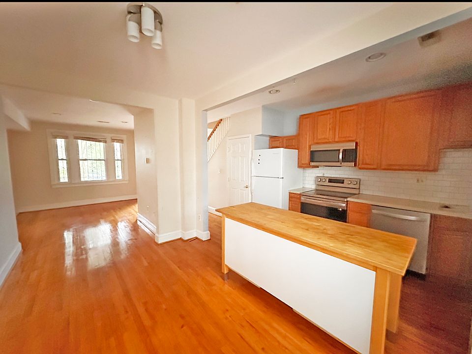 For rent is a tastefully updated home in Columbia Heights. The house features beautiful hardwood floors, 3 bedrooms upstairs (1 best as office or kid's room), 2.5 bathrooms with a skylight in the master bath, newer carpeting and weatherproofing in the basement, a new outdoor deck, new stove with built in air-fryer, new microwave, a large back area which can fit two cars, and a flagstone porch with gardening patch in front. The house has three bedrooms, although one is very small and better suited as an office or nursery. The other two bedrooms are good sized and all three rooms share the top floor. The basement has its own private full sized bath. The house has a washer and dryer in the basement. The house is best suited for 2-3 residents. The Columbia Heights metro is a flat 10 minute walk along 14th Street, and two major bus lines run right by the house. For those commuting in a car, there is an entrance to Rock Creek Park just around the corner. Columbia Heights is a bustling hub of great shopping, fabulous dining, and local bars. Available immediately. Taking applications until October 31. Qualified applicants will need to consent to a credit and reference check. 1 month deposit required. Renter pays utilities (Water, Electric, and Internet). Trash is paid for by owner. Off-Street Parking is available.