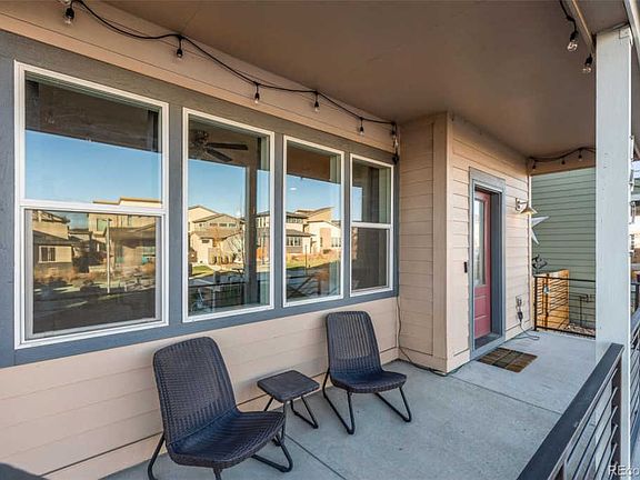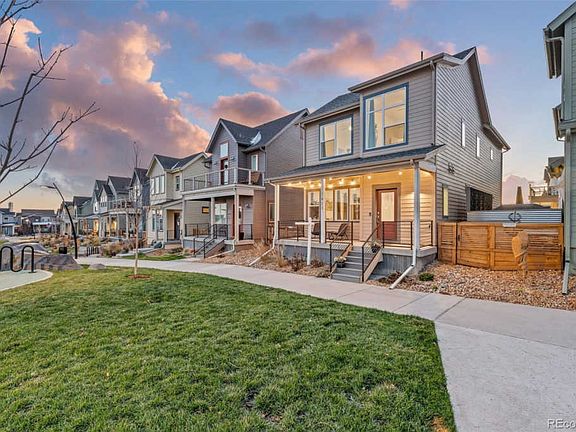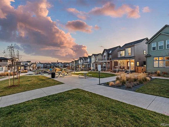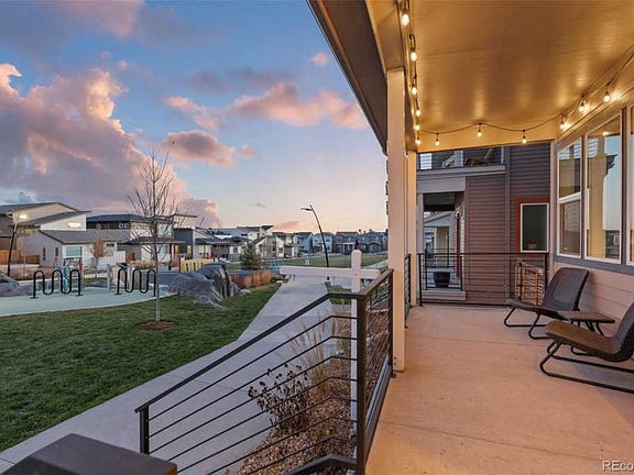 Welcome home to the best Park adjoined lot on the Eastside of Midtown with your own HOA maintained front yard. Sitting atop a grassy hill, fronting the professionally landscaped open space, sip wine from your covered front patio, enjoy mountain views from your master bedroom and gaze at the lights of Downtown Denver from your upper level bedrooms.Entertain friends in your open concept kitchen with Quartz surfaces around the large island and dining area. Sleek Black Stainless Steel Bosch refrigerator included. The wall of windows in the living room allows plenty of natural light into the main living and dining area, while the sliding glass doors allows for seamless indoor outdoor living. The upper level master suite boasts unobstructed Mountain views, custom sliding barn door, ensuite bath and walk in closet with built ins. Two additional bedrooms on the upper level front the park with views of downtown. A full bath and walk in laundry room with storage are also on the upper level. The finished basement with full bath is ready to transform into your home gym, theater or playroom. So many Midtown Amenities: the new Trailside Academy (K-8) and Montessori pre-school, clubhouse, garden, plus multiple dog parks, and playgrounds. The RTD light rail and bus are nearby, brewery with food trucks daily, and bistro with full menu and bar for your evening happy hours. Just 10 minutes from Downtown Denver and 30 minutes from Boulder! This home with all the views is priced below current new construction nearby and is move in ready.