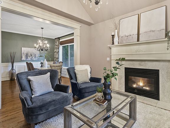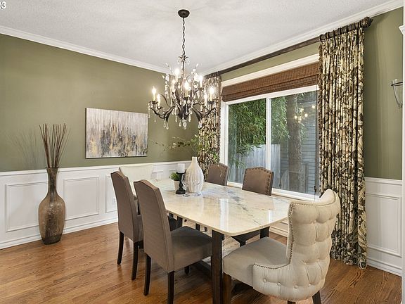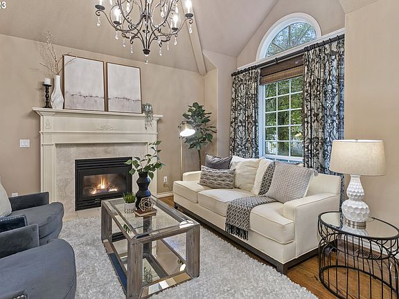 This hidden gem offers a gorgeous private setting, within walking distance of nearby coffee shops and restaurants and just minutes from downtown Portland, the Nike World Campus, or the High-Tech corridor. Beautifully updated with wood floors throughout the main level you are greeted with high ceilings and abundant light. The formal living room has vaulted ceilings, and a gas fireplace and adjoins a formal dining room. Moving to the heart of the home with a gourmet kitchen centered by a huge island with granite countertops and an eating bar for six to gather with family and friends. There are stainless appliances and a gas cooktop, walk-in pantry, and nearby desk space all opening to a huge family room with a gas fireplace flanked by built-ins and a large slider that opens to a beautiful patio with an outdoor fireplace. The main floor also features a large den with extensive built-ins. Upstairs you will find a huge primary suite with everything you would expect from a luxury home. There are three additional bedrooms and a bathroom.
