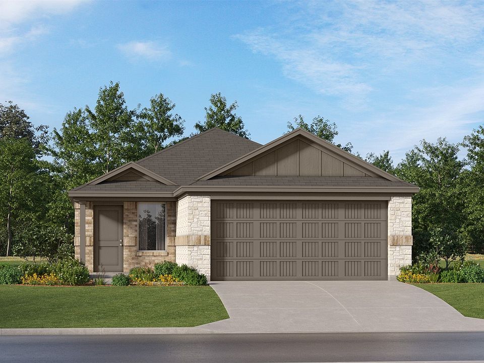 This new home offers simple living with a convenient single-level layout. An open-concept floorplan combines the kitchen, living and dining areas for simple entertaining and multitasking. Three secondary bedrooms are tucked away to the side of the home, and the owner’s suite is nestled into a private rear corner, offering access to a spa-inspired bathroom and walk-in closet.