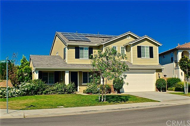 Come see your new 5 Bedroom, 3 Bathroom Executive Eastvale Home complete with Solar Panels, 3-Car Garage on a Corner Lot! This fully-upgraded home features an expansive open floor plan, Formal Living & Dining Rooms with custom neutral paint and flooring that flow throughout the home. Kitchen with upgraded cabinets, recessed lighting, granite counters with glass mosaic tile backsplash, large center island, built-in stainless steel appliances including dual ovens, microwave, cooktop, dishwasher & walk-in pantry. Adjacent to Kitchen is the Family Room with upgraded ceiling fan, fireplace & custom built-in entertainment center. Main floor includes a Full Bedroom and Bathroom. Upstairs includes the Master Suite with dual walk-in closets with mirrored closet doors, Master Bathroom with dual sinks, vanities, custom tile flooring & counters, tile surround at separate shower & soaking tub. Three additional Bedrooms, Guest Bathroom, Laundry Room with wash sink, built in storage cabinets and oversized Linen Closet complete the upstairs. The rustic style Backyard is perfect for relaxing and entertaining with a private spa, Alumawood patio cover, water feature, built-in BBQ, water-wise landscaping with artificial grass, fruit trees, garden & more!