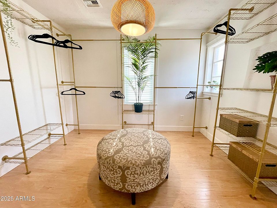 Located in Phoenix's vibrant Garfield Historic District, this 1923 cottage combines historic charm with thoughtful modern upgrades. Just minutes from Roosevelt Row, ASU, Banner and Valleywise hospitals, and downtown dining, it offers unmatched convenience in a walkable, thriving neighborhood. Inside, the highlight is a newly designed, luxurious walk-in closet that delivers exceptional storage and an indulgent dressing experience. The fully finished basement expands living possibilities with a flexible family room, workout studio, or home office. With two bedrooms, one bath, and a multifamily-zoned lot offering future potential, this home blends location, lifestyle, and everyday luxury.