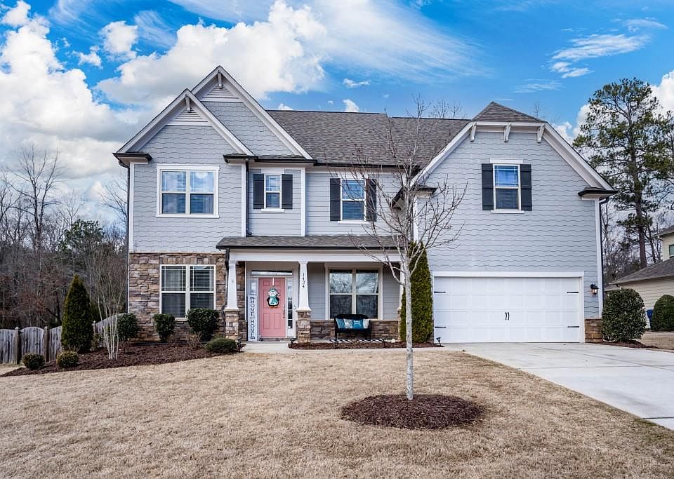 Welcome to this beautiful home in the desirable Mill Creek school district. With a welcoming front porch that is perfect for morning coffee to the open floor plan, this home is something special. Front foyer entryway leads to the spacious Dining Room on one side and what is now a playroom on the other. Playroom can easily be used as home office space, or another living area. Make your way through the home and be amazed by the gourmet Kitchen that boasts granite counter tops, stainless steel appliances, a double oven, a large walk-in pantry, tons of cabinet and countertop space, and a large island that opens to the 2-story Great Room. The open flow is perfect for entertaining friends and family. Enjoy taking some time to relax on the covered and screened back patio. Gorgeous wrought-iron stairway overlooks the 2-story Great Room. Guest bedroom and full bath on the main level, along with a unique, 4 bedroom & 3 full bathrooms configuration on the upper level. Oversized Primary Suite with a large shower, garden tub and spacious dual walk-in closets. Laundry conveniently located on the upper level as well. Great opportunity to be in a "like new" home in a swim/ tennis community, and just minutes away from schools, shopping & I-85!