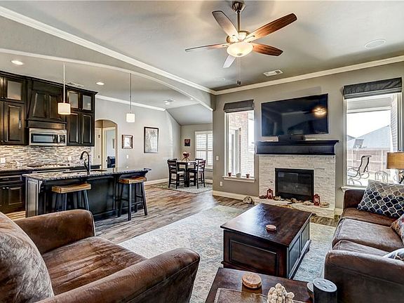 Rare Find!! This well maintained home is located on an oversized lot and features many high end upgrades. The home features 3 bedrooms plus study and includes custom shutters, roman shades, solid core doors, designer hardware and has been wired for surround sound. It has also been wired for home automation! The flooring in the Living room, Kitchen and entry is the wood look tile. The large covered back patio is an entertainers delight with a built-in grill with custom brick work that matches the home exterior, and a cozy built-in fire pit. The master bath room features a Whirlpool tub and walk-in shower. There is a storm shelter in the 3 car garage. Close to the turnpike, Broadway Extension and shopping.