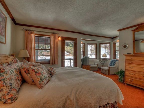 This captivating home is situated on a beautifully landscaped lot with over 140' of private Bear Creek frontage. The home is quality throughout, from the furnishings and decorations, to the design and construction. Each of the 3 bedrooms has a separate door to the balcony overlooking the creek and leading down to the office, exercise room, sauna, and wine cellar. Great rental history, this home will fit a lot of people!