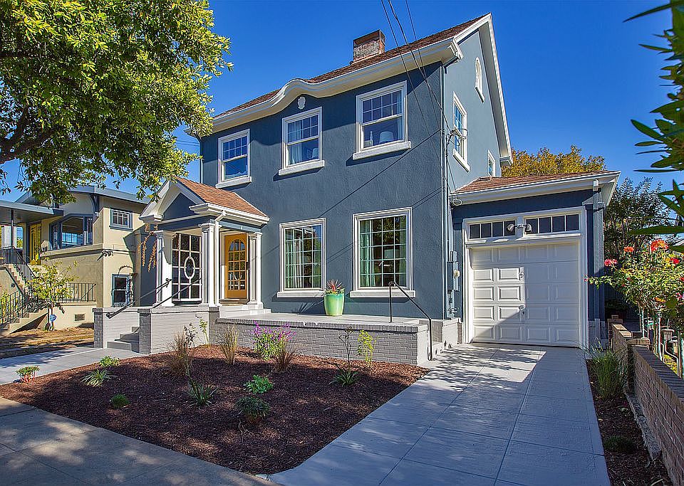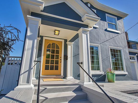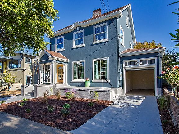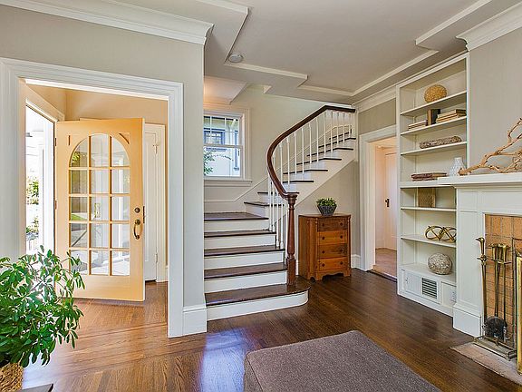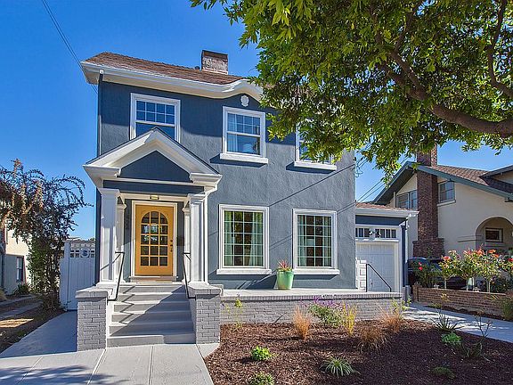 Built in 1915, this sun filled Colonial style home is filled with charming vintage details. Richly painted in a stately navy, the exterior is trimmed in white. A terrace situated under the living room windows, provides a perfect spot for flowers and plants. The front yard has been landscaped with drought friendly plants for a low-maintenance, yet beautiful, front garden. A few steps lead up to the covered porch, framed with wooden columns, and the gold front door with detailed carvings and numerous inlaid windows within an arched frame. The foyer holds a generous coat closet and opens to the living room revealing beautifully coffered ceilings, crown moldings, and high vintage baseboards over richly finished inlaid hardwood floors. The living room is a warm and open gathering space, boasting large divided light windows overlooking the front garden. The wood burning fireplace with a stone hearth and a generous wood mantle is flanked with floor to ceiling bookshelves. An open entry leads to the formal dining room with views out to the backyard. The elegant dining room features a built-in corner hutch with a leaded glass china cabinet. Wall sconces and a drum light add to the natural light that pours in from the 10 light French doors which open onto the outdoor deck, creating a versatile set up for entertaining. The hexagonal breakfast nook is surrounded with windows and an expansive view of the back yard.