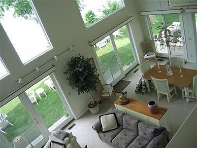LAKEFRONT Orchard Beach custom with steel beam construction contemporary style vaulted ceilings, gourmet kitchen with Corian a countertops and updated appliances and a 250 bottle Wine Cellar. The fabulous window walled living area provides ever-changing lake views through-out! Your private staircase allows access directly into the lake for sandy bottom shallow swimming. A ground floor en suite master bedroom and bath, and room for plenty of guests in the upstairs large dormitory size bedroom makes this home perfect friends and family and for year round comfort. The entire home is powered by an automatic switch powered Generator, and the Rainbird Irrigation waters your yard shrubs and hanging baskets too! Private Association beach and community park; a private marina with direct access to the lake make this area a great neighborhood!