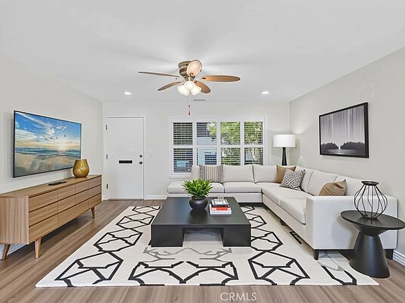 RECENTLY REMODELED SINGLE-FAMILY HOME ON A CORNER LOT, ATTACHED ON ONLY ONE SIDE, NO ONE ABOVE OR BELOW, WITH PATIO ACCESS TO 2-CAR GARAGE! Open floor plan and large windows, all with plantation shutters, bring in lots of natural light. Living room is open to dining room, and dining room is open to remodeled kitchen with recessed lighting, quartz countertops, and stainless-steel appliances. Kitchen windows and sliding glass doors in dining room and one of the back bedrooms open to a large private back patio with wood fence and block wall, where you can relax and barbeque. Recently painted, and newer laminate flooring throughout except for carpet in primary bedroom. Large primary bedroom has ensuite full bathroom. Down the hall is a second full bathroom, and two additional bedrooms at the back of the home. Newer Central A/C and water heater, dual-pane windows, and smooth ceilings. Ceiling fans in all bedrooms, and recessed lighting in living room, dining room, kitchen and one of back bedrooms. Community has an association pool and spa, and is next to Boisseranc Park, a public park with lighted tennis courts, pool, handball courts, baseball fields, playground, and picnic area. Conveniently located near 91 and 5 freeways.