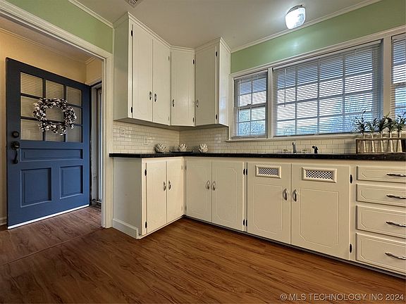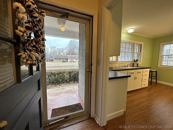 Lovely Home on rare Large 2/3 acre flat yard in desirable East side Bartlesville: space for expansion or future workshop addition, pool, or garden. Light and Bright Living room w/ decor-only fireplace, opens to Den w/ wood-burning stove, desk & built-in dual closet Storage. Cheerful Kitchen with white subway tile backsplash, has white trim & cabinets, and a row of windows at the sink. Refrigerator & retro electric range/oven stays! Wood laminate floor flows from kitchen down hallway. Original hardwood floors beneath carpeted areas. Primary bedroom has a wall of deep storage, cordless blinds throughout home. Central Heat & Air, 1 full bath w/ tile floors, shed plus 1 car garage w/ garage door opener. Separate Laundry room doubles as mud room. In 2011: New ROOF, sewer lines replaced from house to main. In 2012: New water lines from street to under the home. In 2016/2017: new guttering, new hot water heater, fence w/ double width gate access, fresh trim paint, and Insulated Exterior Den doors. In 2003: Dual width Concrete Driveway. Great location less than 1.6 miles from East Side Shopping, and wooded Sooner Park-Pond-Golf-Tennis-Pool, and Pathfinder Nature Trails. Less than 0.7 miles from Ranch Heights and Tri County Tech Schools. Location-Location-Location with a HUGE accessible back yard, within town, is not easy to find, but here it is!!! Tidy & Move in Ready!