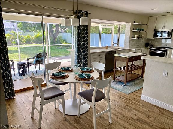 Looking for that Florida vacation home where everything has been updated and ready for you to move into? Come see this cheery Cape Coral cottage. Drive up to A welcoming front porch with brick pavers to greet your guests. An additional car paver parking pad is on side to allow more space and ease of parking. This sunny home features A bright open floor plan with a dream kitchen with shaker cabinets, quartz countertops, stainless appliances and walk in pantry with sky light. Easy care porcelain plank flooring throughout the entire home. Enjoy sunset views from oversized screened patio with large glass pass through from kitchen. The patio also feature a long quartz countertop so convenient to sit at or for buffet style entertaining. The rear generous sized back yard is fenced in so plenty of room for your pets to explorer. This partially furnished home can be rented easily and your dogs will have room to play. Updates inc: roof 2020, hot water tank 2023, r-30 insulation added 2023, sprinkler and fence 2023. NO flood insurance required here, and all assessments paid. Sellers have engineered plans if you want future add'l bathroom. Great SE location close to stores and restaurants.