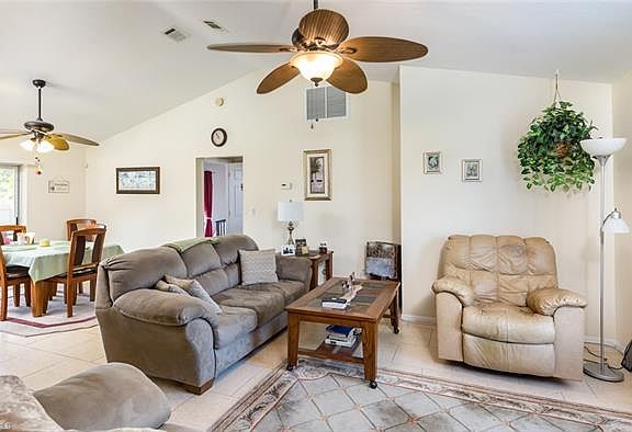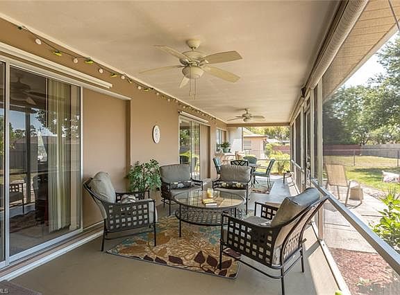 This charming convenient SE home has desirable southern exposure for bright light interior. French doors lead into a tiled open GREAT room with CATHEDRAL ceilings. This delightful eyeful home has had the all the work done to make living here a breeze and move right in. Enjoy cooking and entertaining in this beautifully updated "Cornestone" kitchen including large GRANITE countertops and updated cherry faux wood cabinets and updated stainless appliances and recessed ceilings and pendant lighting. A Convenient sliding pass through window from the kitchen makes for easy entertaining to the huge patio.The entire house has all light easy care oversized tile floors : perfect for kids or pets. A party is just waiting to happen on the oversized screened lanai 10X39.11! Plenty of room to install a pool or play equipment and the yard is ready and fenced for your pets. More updates included newer front windows and storm shutters for openings. Central Cape location off Del Prado close to everything shopping, restaurants and easy commute to Fort Myers. Located in a "X"zone so no flood insurance mandatory here. All assessments in and paid ! Start planning now for next years winter here !
