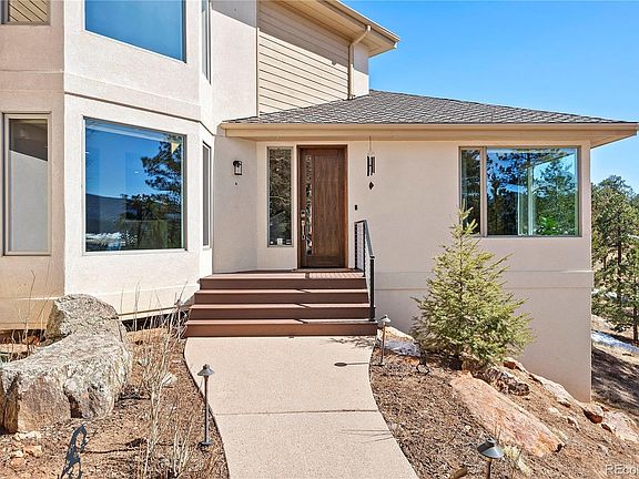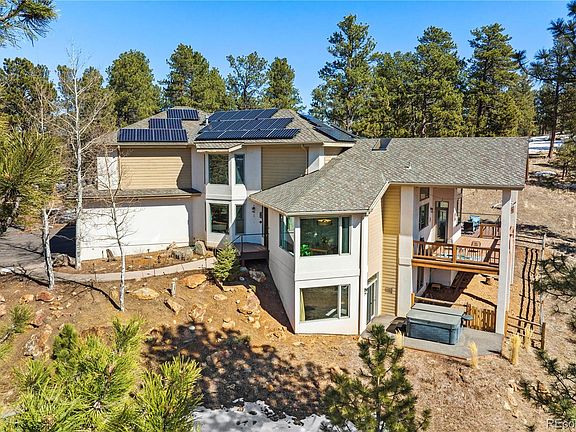 Mountain Mod with a Side of Style! From the moment you ascend the private drive to this extraordinary Evergreen home, you just know the views are going to be jaw-dropping. The 4 bed, 5 bath mountain contemporary sits on a prime 1.6 acre lot in the highly regarded Ridge at Hiwan, and adjoins 12 acres of protected open space. The home is light filled and fresh with modern light fixtures, clean lines, coffered ceilings and vibrant accents. The brand new designer kitchen is as stylish as it gets! Custom walnut cabinetry with gold toned hardware is flanked by tilework that incorporates classic neutrals with a dash of whimsy. It is thoughtfully laid out and luxuriously appointed, from the honed black countertops to the built-in apron front sink, drawer inserts for pots, pans and spices and top-of-the-line appliances. The french door bev fridge is a fun touch and the stainless composter is environmentally chic. This sunny chef’s kitchen opens to a dining nook and great room that feature walls of glass and views for days. Outdoor living is maximized with an expansive, covered deck w/ more of the amazing views. A convenient main floor primary suite is recently renovated and gorgeous with spacious custom closets and a spa worthy ensuite! A formal dining room and vaulted living room round out the main level. Upstairs you’ll find 3 big bedrooms, all w/ window seats, and 2 full baths. The spacious lower level is perfect for entertaining with a large rec room, full bathroom, direct access to an outdoor hot tub, plus a 600sqft unfinished bonus room - finish for instant equity - gym? theater? The 34 solar panels top things off! The pinnacle of North Evergreen, the Ridge at Hiwan, is a spectacular mountain setting. Owners have access to hiking and biking trails and all the recreational paradise of Elk Meadow Open Space. Situated minutes from I-70, commuters can get to downtown Denver in 30 minutess and the shops, services, and restaurants of Bergen Park are within walking distance.