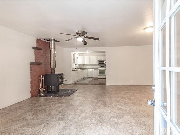 Spacious ranch-style homeLarge kitchenEntertainment-sized deckDining areaCozy freestanding wood stove