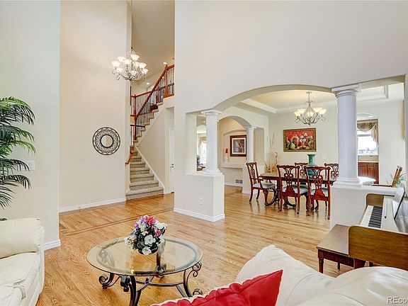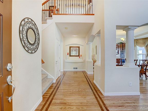 Backs to Golf Course with water and city views. This beautiful home has a grand foyer with extensive stair railings. Many updating in the house with high end finishes: hardwood floors throughout the main level, new carpet with extra padding, granite counter tops, stainless steel appliances, tiled bathrooms, surround system, new exterior paint, new dishwasher, newer hot water heater and a lot more. Open floor plan, light and bright. All the rooms are of generous sizes. Main floor has formal dining room, living room, family room with fireplace, study room with built in book shelves, a large kitchen with eating nook, island and a walk in pantry. Upper level has a guest suite with its private bath, 2 secondary bedrooms with shared bath, and a generous master suite with a large sitting area and a 2-sided fireplace, gorgeous 5-piece master bath, large walk-in closets with built-in shelving. Major rooms all have golf course views. Unfinished full basement with tall ceilings is ready for expansion. Professionally landscaped backyard with extensive stone pavements and covered patio is perfect to enjoy the wide open views. Property located in mature and quiet neighborhood. There are many parks, trails, grocery shopping centers and recreation centers around. It is centrally located between Denver and Boulder and is very close to major highways. It is within walking distance to top rated schools. Immaculate condition. Quick possession.